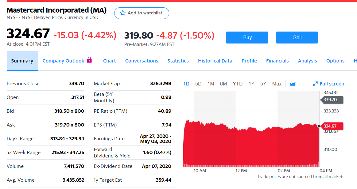 マスターカード(MA)来期売上予測を下げる!!新型コロナウィルスによる旅行の激減によるため。